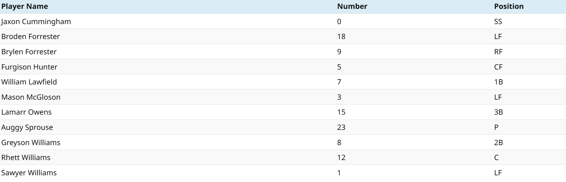 | Player Name | Number | Position |